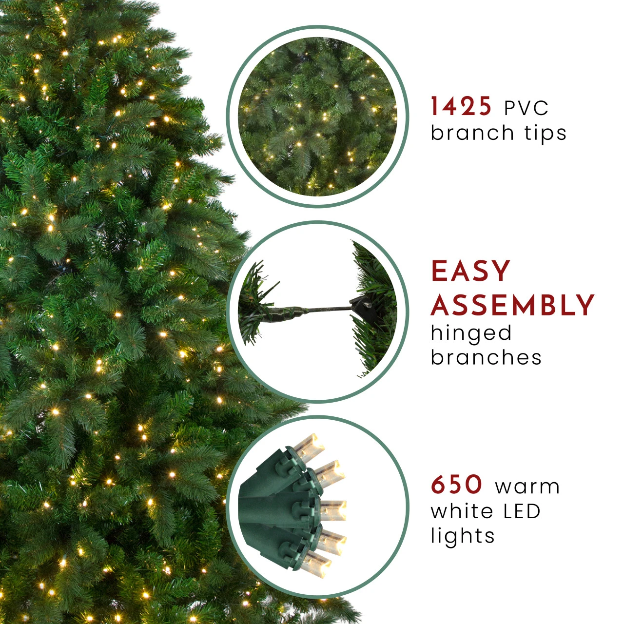 Dimensions: 7.5′ high (from the base of the stand to the top of the tree)